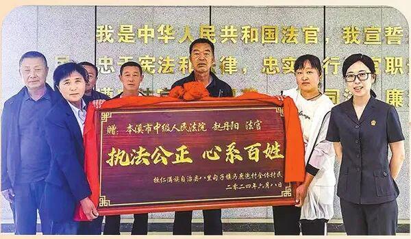 2024年6月的一个早上,几位村民抬着半人高的牌匾来到本溪中院,牌匾上书“执法公正心系百姓”八个大字。