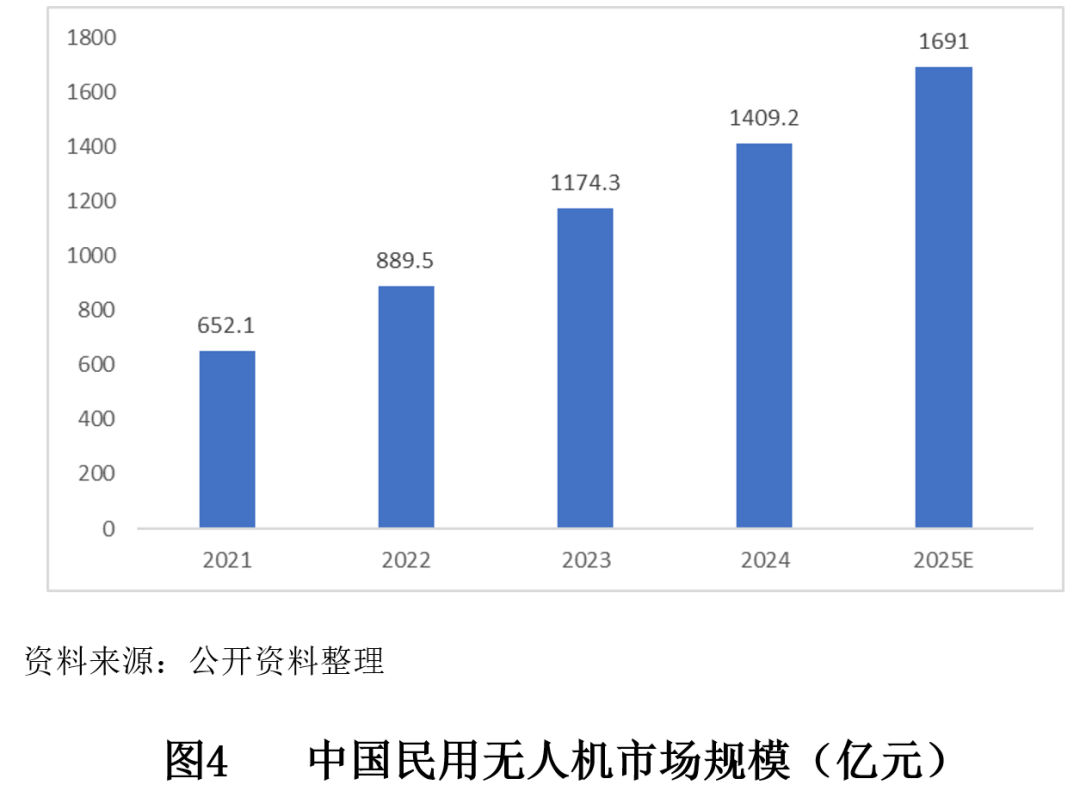 2024年中国民用无人机市场规模达1409.2亿元,同比增长约20%,延续高速增长态势。受益于低空经济政策推动、工业级应用加快拓展,以及智能化技术持续突破,无人机在电力巡检、农林植保、安防监控等领域的渗透率不断提升,市场结构逐步由消费级向工业级升级,产业发展迈入提质扩容新阶段。预计2025年中国民用无人机市场规模将达到1691亿元。