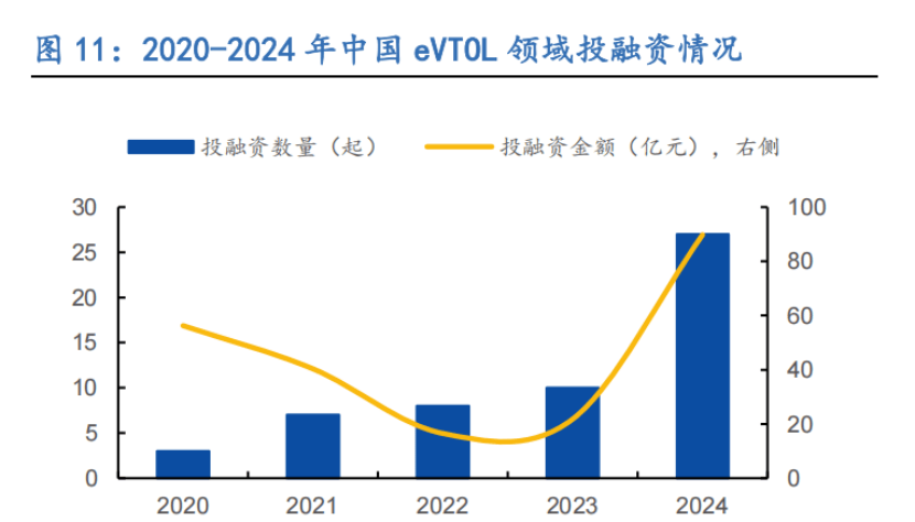 中商产业研究院发布的《2025-2030全球与中国eVTOL市场现状及未来发展趋势》显示,2024年中国eVTOL领域相关投融资金额达到89.7亿元,同比+310%,投融资数量达到27起,同比+170%。