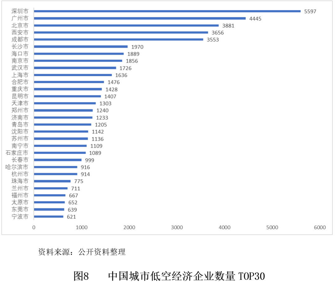 城市层面来看,我国低空经济呈现“五城引领、集群联动”格局。深圳、广州、北京占据前三,低空经济企业数量分别为5597家、4445家、3881家,产业集聚能力强劲。西安、成都两大西部中心城市异军突起,企业数量分别达3656家、3553家,分列第4、5位。这五个城市的合计占比为23.71%,其余城市企业数量均不足2000家。