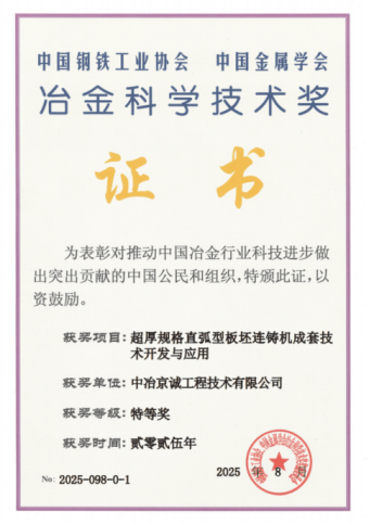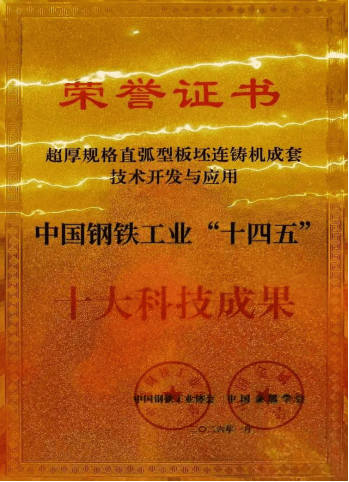 “超厚规格直弧型板坯连铸机成套技术开发与应用”荣获“钢铁工业十大科技成果”。该创新成果由中冶京诚牵头,联合东北大学、江阴兴澄特种钢铁有限公司等单位协同攻关,成功突破超厚规格连铸领域长期存在的技术瓶颈,填补了国内行业技术空白,实现了该领域高端装备与技术的完全自主可控。作为保障国家重大工程高端钢材供应的关键技术支撑,该成果已荣获2025年冶金科学技术奖特等奖,将我国连铸技术推向国际领先水平。